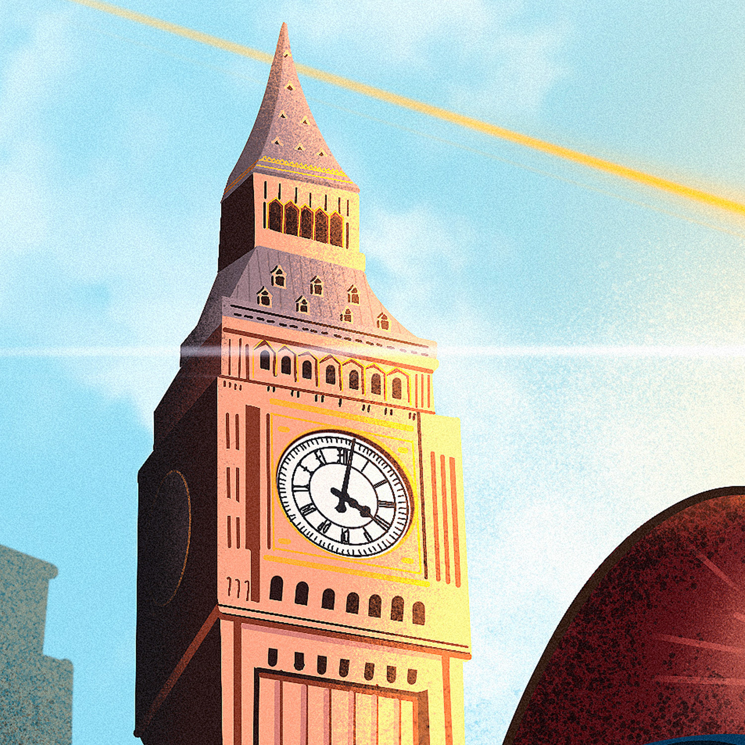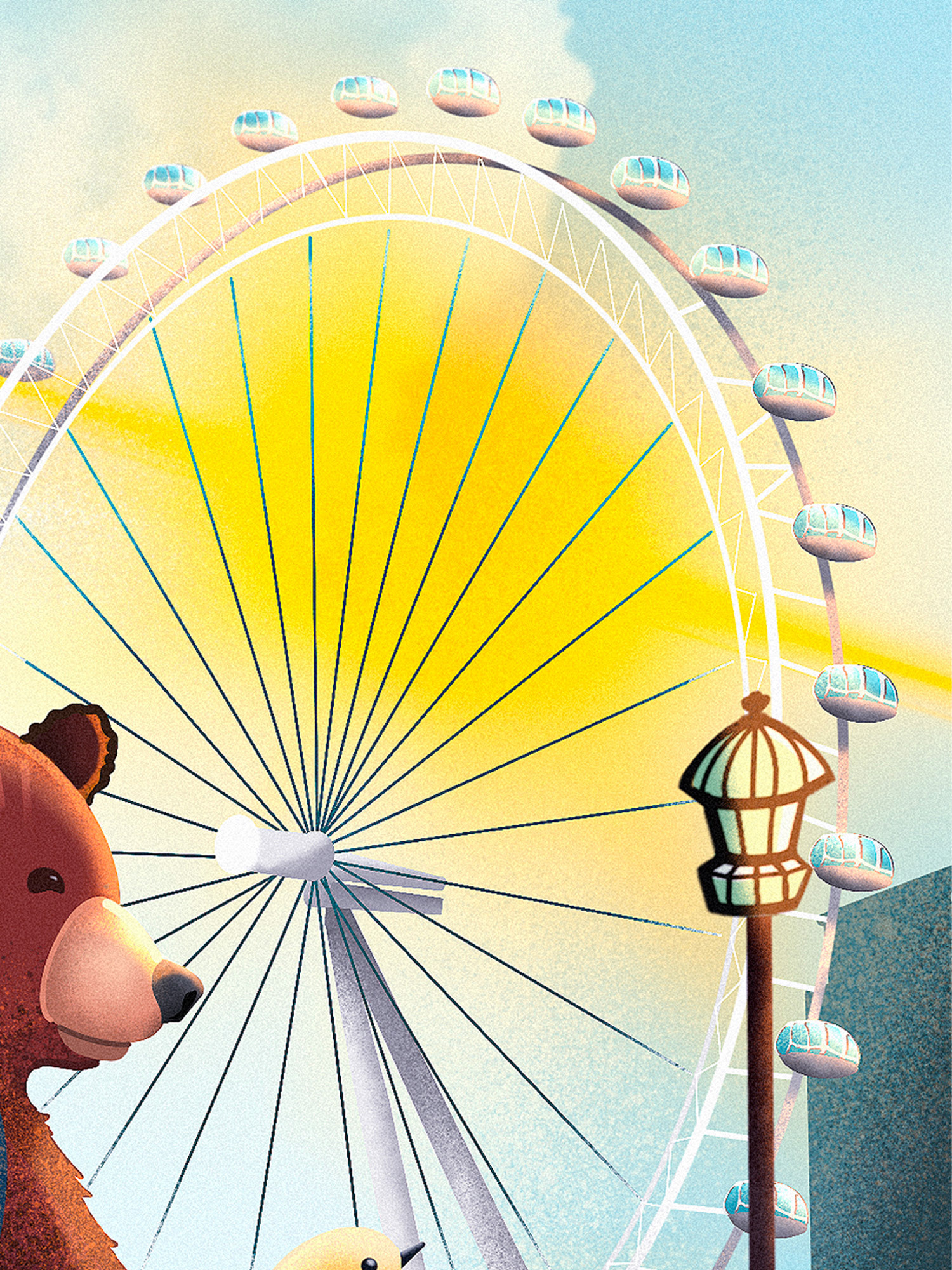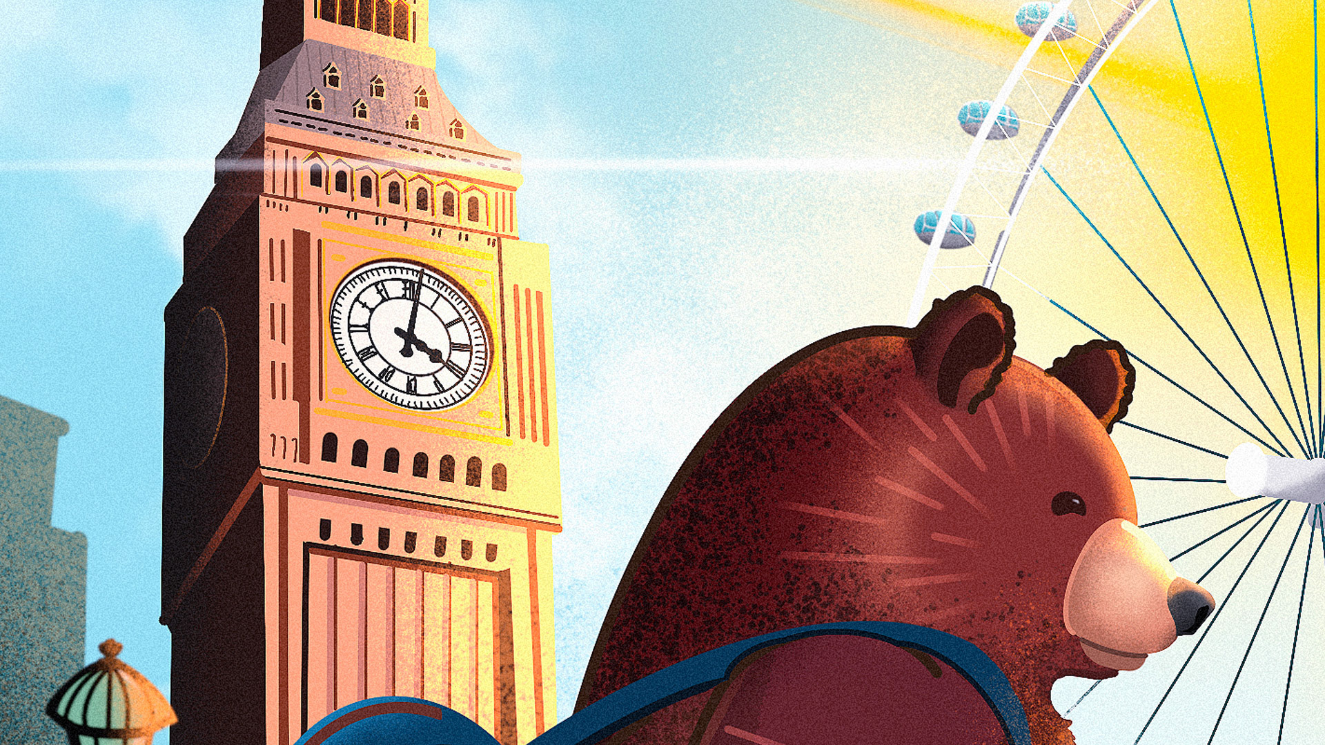 This illustration combines the enchanting atmosphere, history, and modernity of London, bringing to life a moment where Bear and Little Bird enjoy an unforgettable day.